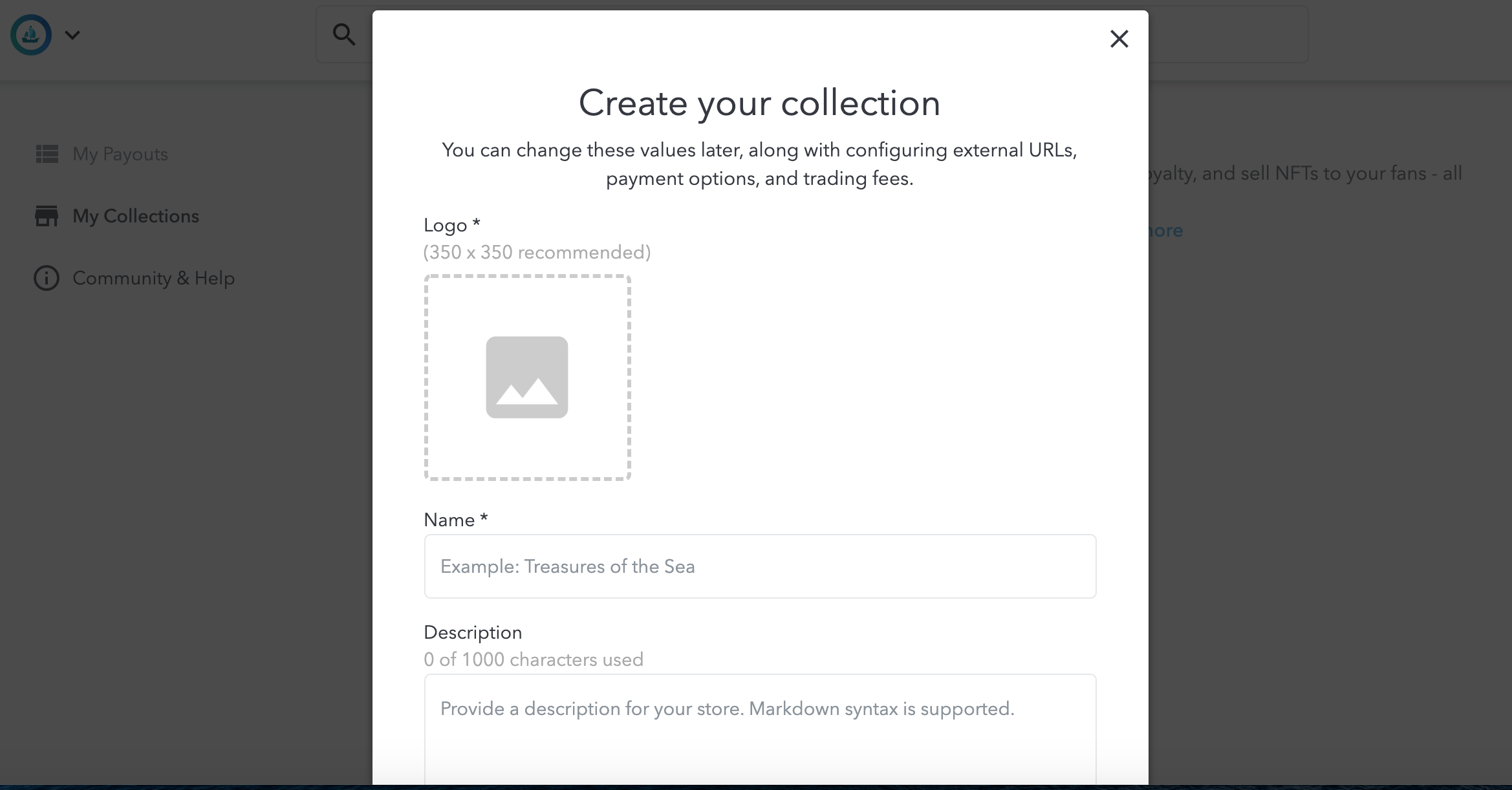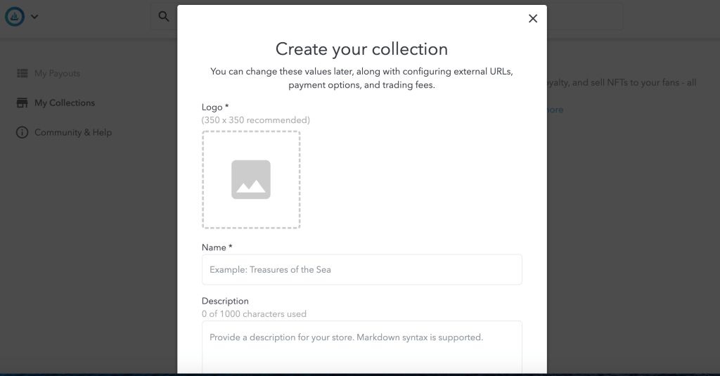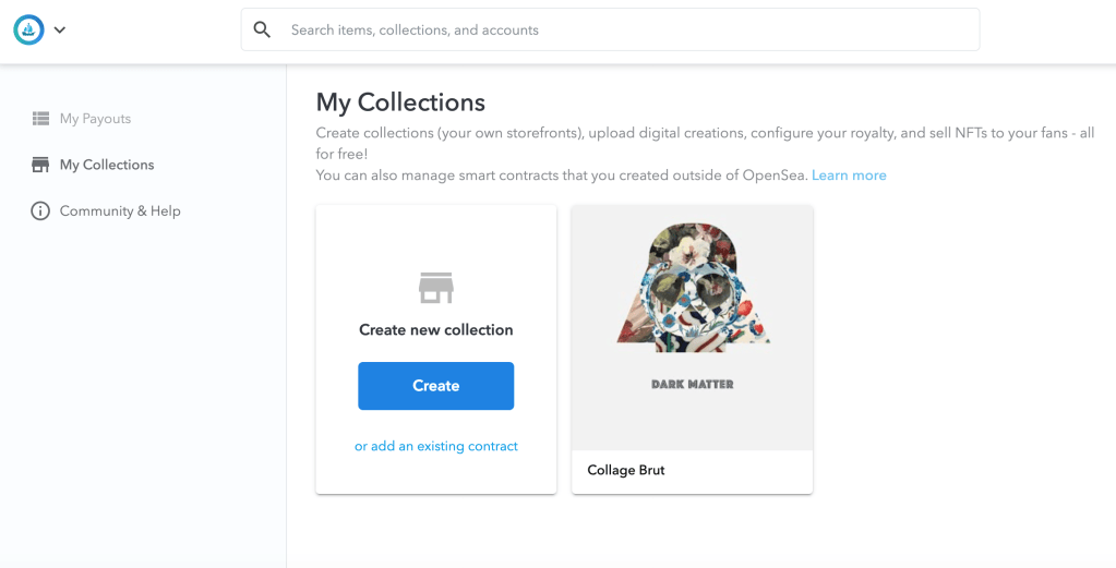 ‘Create’ butonuna tıkladıktan sonra ‘Create New Collection’ a tıklıyoruz. Aşağıdaki sayfa açılacak. Tabi benim daha önce oluşturduğum koleksiyon görünüyor. Sizinki boş olacak. Benim koleksiyonu görüntülemek için linke tıklayabilirsiniz: https://opensea.io/accounts/ENDAM