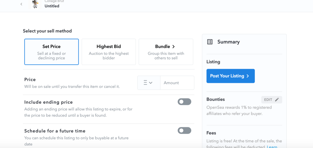 ‘Amount’ kısmına satmak istediğiniz fiyatı girip, ‘Post Your Listing’ butonuna basmanız yeterli. Eser için sabit bir fiyat oluşturabilirsiniz veya açık artırma ile belli bir süre içinde talep toplama yöntemi ile satmayı tercih edebilirsiniz. (Bu aşamada cüzdanda oluşacak gas fee için bir miktar ETH olması gerekiyor.)